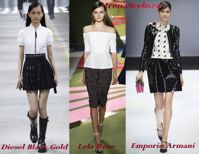 Стильно и неординарно выглядят черные изделия, дополненные выделяющейся белой баской. Можно видеть модели, где все наоборот. Изделия гармонично соединили в себе непосредственность, элегантность и женственность.