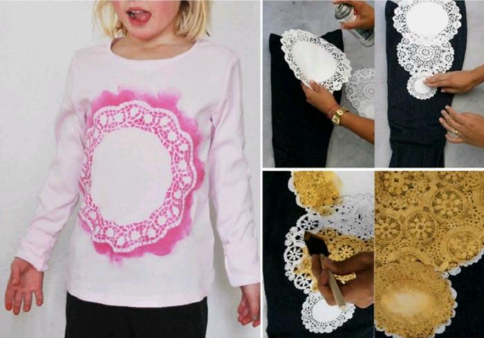 В качестве трафарета отлично подходят обычные бумажные салфетки. Красивый кружевной узор выглядит романтично не только на футболках, но и на джинсах.