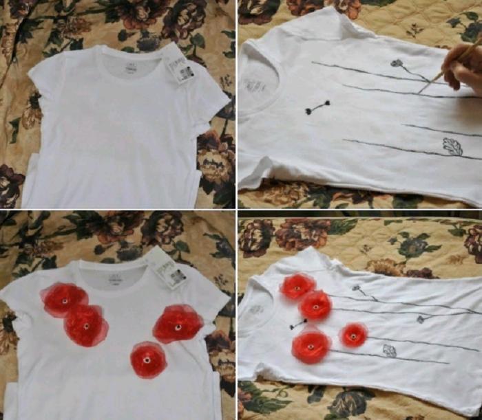 Затем нарисовать стебли мака на простой белой футболке. Для этого лучше всего использовать акриловую краску, так как она хорошо ложится на ткань. Поместить цветы на футболку возле стеблей и пришить их.