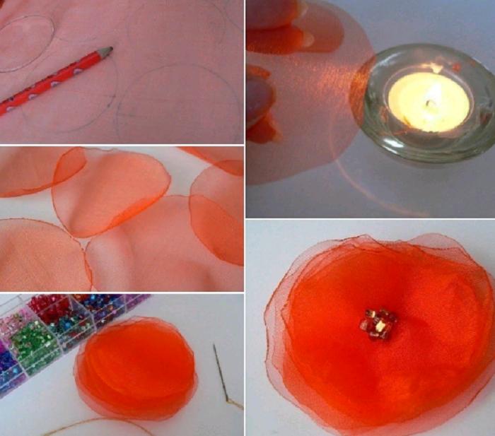 Цветы мака могут стать отличным украшением для летних футболок. Нужно вырезать круги из красной органзы. Количество кружков зависит от того, насколько большим вы хотите сделать цветок мака.