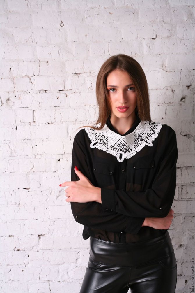 Воротник можно выполнить из купленного в магазине гипюра или связать крючком. Сделайте из бумаги выкройку, из гипюра выкроите две одинаковые детали, сшейте их и выверните швами внутрь. Зашейте потайным швом последнюю сторону, пришейте крючки или кнопки. На джемпер (с внутренней стороны горловины) пришейте петли или вторую половину кнопки, чтобы они совмещались с воротником. Вуаля!