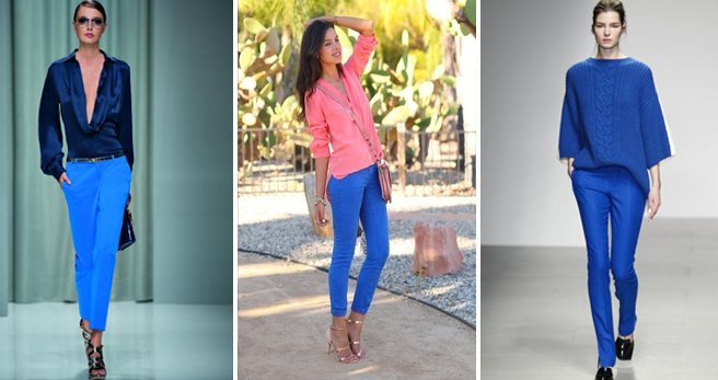 Ярко-голубые штаны в сочетании с босоножками черного цвета выглядят контрастно, оригинально. Созданный сет нуждается в привлекательном верхе. Это может быть легкая блуза без рукавов кораллового тона. Не стоит забывать о подходящих аксессуарах, расставляющих недостающие акценты.