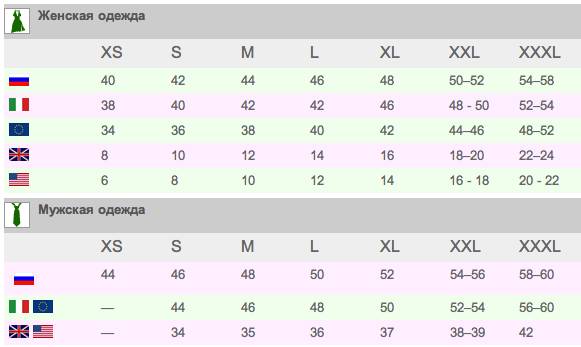 Таблицы соответствия российских, американских и европейских размеров: