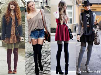Идеально смотрится такой ансамбль: длинный свитер, короткие шорты или юбка и вязаные аксессуары. Джинсовые и шерстяные платья – тоже беспроигрышный вариант. Юбка-карандаш хорошо сочетается с данными предметами гардероба, только в этом случае они должны быть ниже колена. Считается, что лучше всего, чтобы юбка заканчивалась там, где начинаются чулки.