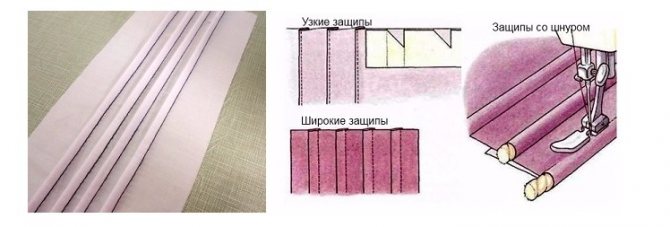Защипы служат двум целям: созданию формы изделия и его украшению (декоративные защипы). Каждая складка представляет собой тонкий зашитый сгиб ткани по длине изделия. Декоративные защипы делают с лицевой стороны изделия по долевой линии ткани.