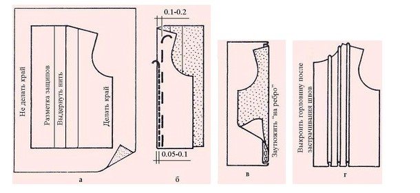 - Складки, идущие от плечевого среза, на левой полочке нужно застрачивать сверху вниз, на правой — снизу вверх.