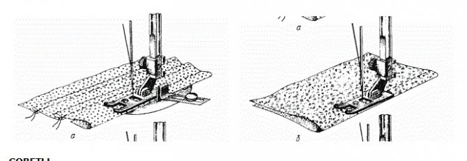 Сложить ткань вдвое по намеченной линии и подложить под лапку так, чтобы линия сгиба ткани проходила вровень с правым краем лапки. Ширину складок можно изменять в зависимости от положения иглы, которое регулируется рычагом управления. При выполнении складок шириной 0,4 см игла должна проходить по центру прорези лапки (рисунок 12а), для чего рычаг поставить в центральное положение. Для складок шириной 0,6 см рычаг следует повернуть влево (рисунок 12б), а шириной 0,2 см — вправо.
