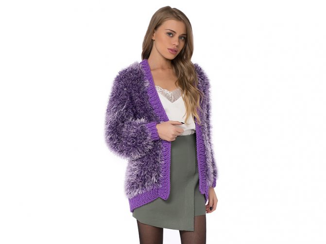 - Сборка. Сформируйте плечевые швы, присоедините капюшон к вырезу воротника и частично к сторонам полочек. Для планки наберите на 6-е спицы 6 п. (фиолетового тона), вяжите платочной вязкой, присоединяя планку к изделию. Для этого провязывайте по 2 петли вместе со стороны изнанки работы. Этим методом обвяжите по кругу. Пришейте рукава, сделайте боковые швы. Для каждого шнурка-завязки наберите на шестые спицы 6 петель и свяжите 120 см, после чего их нужно пришить к планке. Низ кардигана и манжеты обвяжите с помощью техники «рачий шаг» (или «английская резинка»), используя меланжевую нить и пятый крючок.