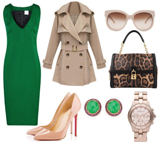 Платье цвета зеленой листвы можно носить с бежевым плетеным ремнем, медным кулоном на тонкой цепочке. Сексуальности придадут туфли или босоножки с деликатным анималистическим принтом. Сумку можно выбрать коричневую с нотками рыжего.