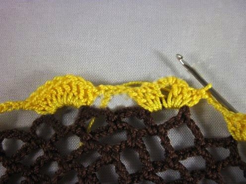 Первый желтый ряд вяжется так: в арке последнего черного ряда из двух воздушных петель свяжем два столбика с одним накидом, две воздушные петли, два столбика с одним накидом, пять воздушных петель и девять столбиков с двумя накидами в арку предыдущего ряда из двух воздушных петель, пять воздушных петель. Далее описанные действия необходимо постоярть по кругу.