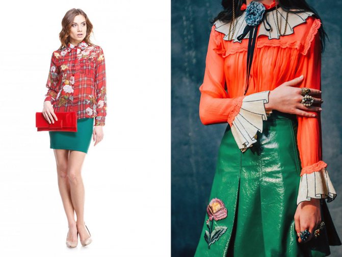 Зеленая юбка, красная блузка – образ, с которым можно крупно ошибиться. Лучше всего выбирать юбки, у которых зеленый тон присутствует в качестве принта, а основным оттенком выступает нейтральный цвет – молочный или бежевый. Если же юбка целиком пошита из однотонного зеленого материала, да еще и яркого, то красный блузон здесь может сыграть злую шутку и превратит вас в подобие новогодней елки.