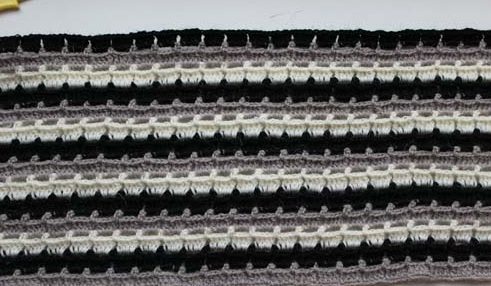 2 р-д: 3ВПП, 3 РСзаПС (рельефный столбик за переднюю стенку), 3РСзаЗС (рельефный столбик за заднюю стенку), * 3 РСзаПС, 3РСзаЗС* — повторять * * до конца ряда, ССН.