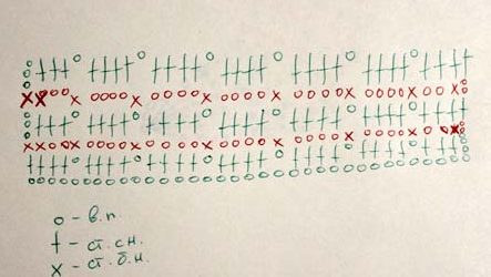 Сделать воздушную цепочку равную ширине изделия плюс три ВП для подъема ряда. Дальше вяжем по схеме и описанию:
