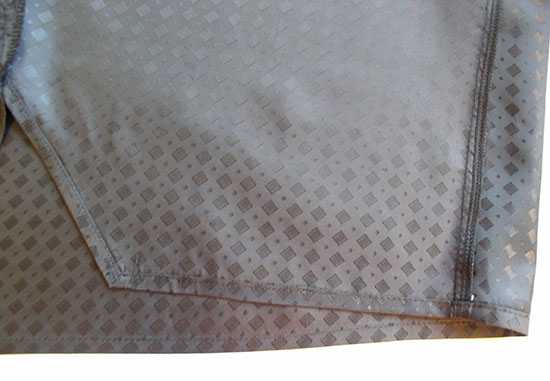(на лицевой поверхности ткани не должно быть: инородных волокон, коротких утолщений нитей, отсутствия одной или нескольких нитей основы или нитей утка, разнооттеночности. Не должно быть дефектов в окраске ткани. Все обнаруженные дефекты отметьте мылом или мелом на изнаночной стороне ткани. Обратите внимание на них при раскрое.