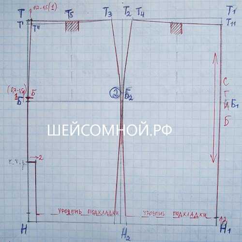 - Т2 вправо и влево по 2,5 см = боковая вытачка. От точки Б2 вверх откладываем 2 см = это точка — верхушка боковой вытачки.