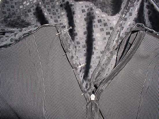 | Подкалываем иголками припуск подклада к тесьме молнии и соединяем строчкой, подходя сверху и снизу насколько возможно подвести лапку машины. Сначала с одной стороны, потом с другой.