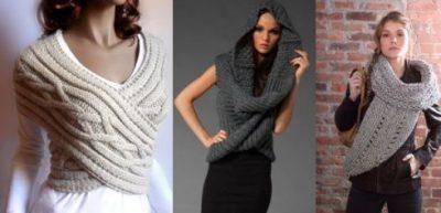 Если изящный снуд связан крючком, он послужит украшением к вечернему платью, а для смелых девушек заменит блузку или платье. Теплый большой шарф-труба с успехом заменит болеро, накидку, капюшон, пелерину.