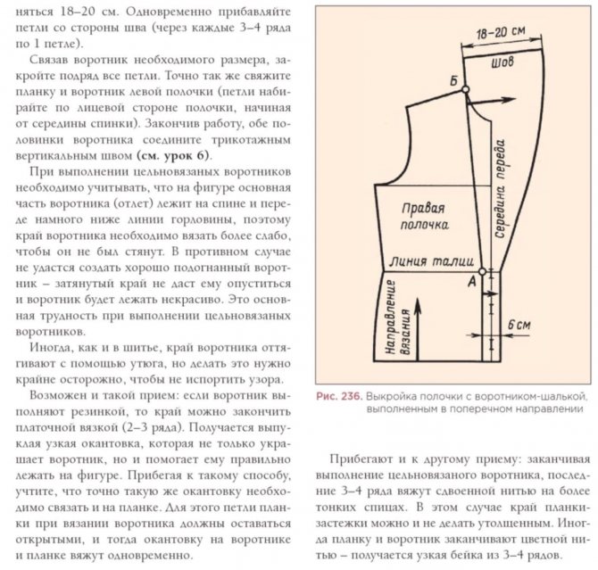 Перед нами женская кофточка с шалевым воротником спицами (рис. 235). Здесь воротник связан с поперечном направлении. И второй вариант – кофта с шалевым воротником, где воротник шалька может быть выполнен непосредственно вместе с полочкой.