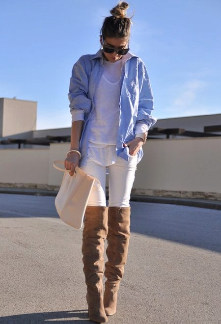 На основе бежевых ботфорт можно создать и классический образ. Подберите соответствующие зауженные брюки, заправив их в голенища сапог и дополните однотонной блузой или рубашкой. В сочетании со светлыми сапогами хорошо будут смотреться классические вещи розового, коричневого и серого цветов.