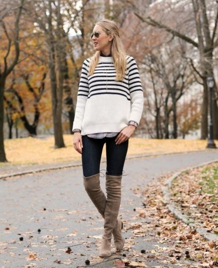 - Вязаное облегающее или прямое платье-свитер. Однотонное или в полоску. В одежде под сапоги, имеющие узкое голенище, делают акцент на плечах. При создании многослойных композиций надевают облегающее платье с кардиганом или удлиненным жилетом. При этом длина платья и верхней одежды должны совпадать.