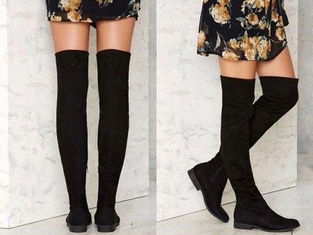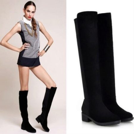 Замшевые ботфорты без каблука не закрывают длинным подолом, брюками. К такой обуви лучше подбирать одежду длиной мини или миди. Утонченное платье с замшевыми ботфортами создадут романтичный, женственный образ. Светлые сапоги выше колен подойдут к короткому платью или юбке.