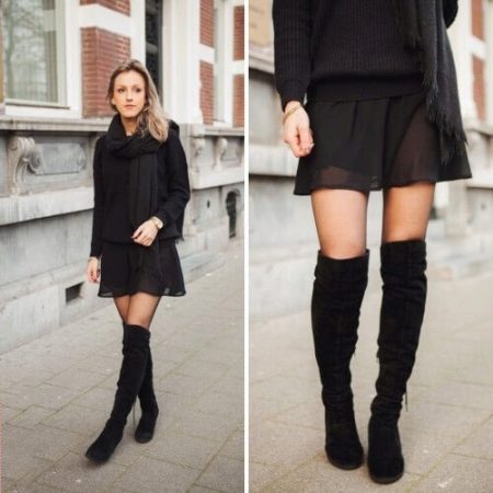 Ботфорты сочетаются с одеждой от джинс до коротких сарафанов. Возможен комплект с верхней одеждой. Например, сапоги темного цвета, бордовая дубленка, голубые джинсы и шапка будут отличным сетом.