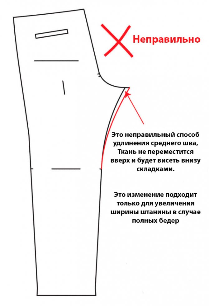Я также часто вижу вот такой совет, как на рисунке выше. Опять же, излишек ткани, появившийся от удлинения шагового шва не поднимется и не расположится на ягодицах волшебным образом там, где это нам необходимо.