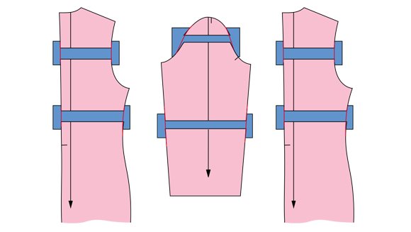- Выкроеные фрагменты снабжаются двумя фундаментальными прямыми. Изменения производятся согласно этим отметкам, которые остаются на прежних местах. К фундаментальным относятся прямые: