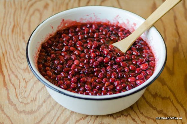 - Теперь весь объём сахара поделите поровну. Каждой секцией присыпьте кизил и барбарис. Вымешайте состав рукой, оставьте на 2 часа. Через это время добавьте воду к кизилу и поставьте на плиту.