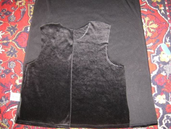 Нам не потребуется бумажная выкройка мехового жилета. Её роль выполнить подходящая по размеру маечка. Прикладываем майку на велюровую ткань и обводим с припуском.