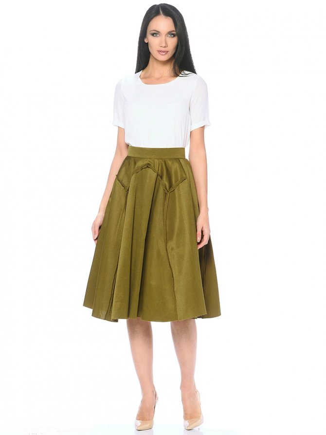 Юные девушки и модницы более зрелого возраста будут покорены фасонами и моделями в которых проявляется творческий полет вдохновения дизайнеров. Ткань юбок в создании образа подбирается с учетом настроения и случая выхода: • роскошный атлас в оттенке хаки смотрится великолепно и придает образу особую загадочность; • шикарный и статусный бархат в бутылочном оттенке – это новое слово в моде; • великолепный, королевский шифон нежность материала и строгость цвета. Такая юбка подарит несравнимое чувство соблазнительности и воздушности.