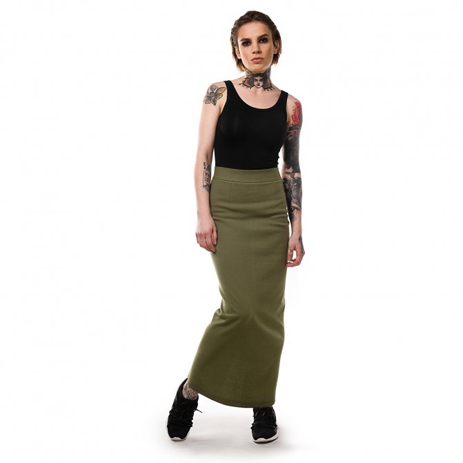Длинная юбка цвета хаки может использоваться даже для вечерних, романтических встреч.