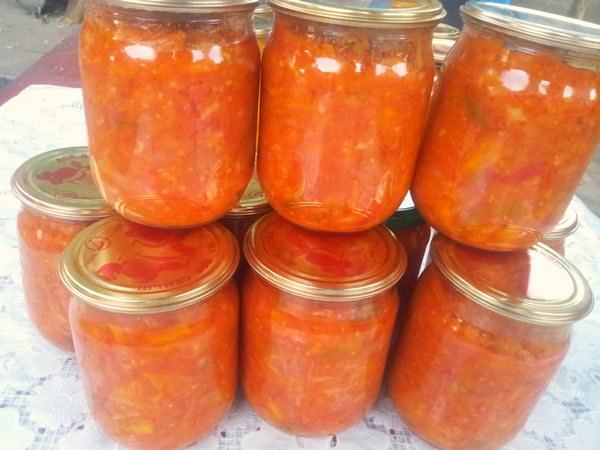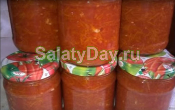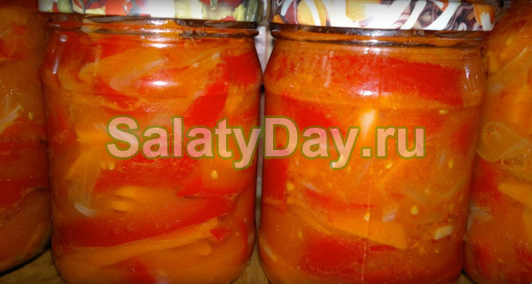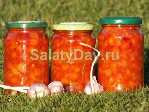 Приготовление салата начинаем с того, что в глубокой кастрюле перемешиваем морковь с помидорами и томатным соком. Содержимое кастрюли следует довести до кипения и тушить в течении 30 минут. По истечении этого времени добавляем в кастрюлю лук, перец, паприку, масло, соль и перец и тушим ещё 20 минут. В самом конце добавляем в салат уксус, сразу разливаем по банкам и закатываем.