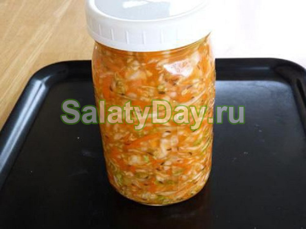 Такой салатик может храниться достаточно долго, однако, опытные кулинары не советуют его употреблять в пищу по истечении восьми месяцев.
