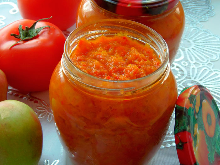 Моем помидоры и перекручиваем через мясорубку. Полученное томатное пюре помещаем в глубокую кастрюлю и ставим на огонь. Томаты должны прокипеть примерно 20 мин. По истечении этого времени к ним следует добавить измельчённый чеснок, мелко нарезанный горький перец, соль, сахар и растительное масло. Всё следует перемешать и прокипятить на протяжении 5 минут.
