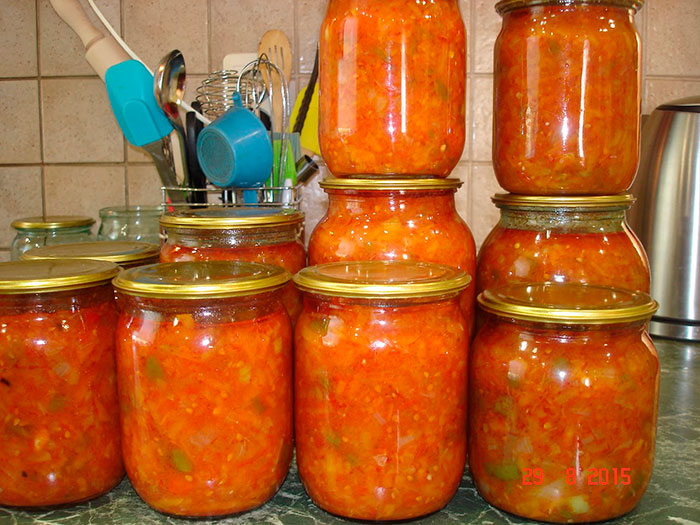 Овощи чистим, моем и просушиваем. Морковь, лук и перец нарезаем крупной соломкой, а помидоры — трём на мелкую тёрку, или пропускаем через мясорубку. Когда все составляющие блюда подготовлены, можно приступить непосредственно к процессу приготовления салата. Для этого, в глубокую кастрюлю укладываем лук, перец, морковь и перекрученные помидоры, перемешиваем и ставим на мелкий огонь. Спустя 5 минут добавляем к овощам соль, сахар, растительное масло и тщательно перемешиваем.