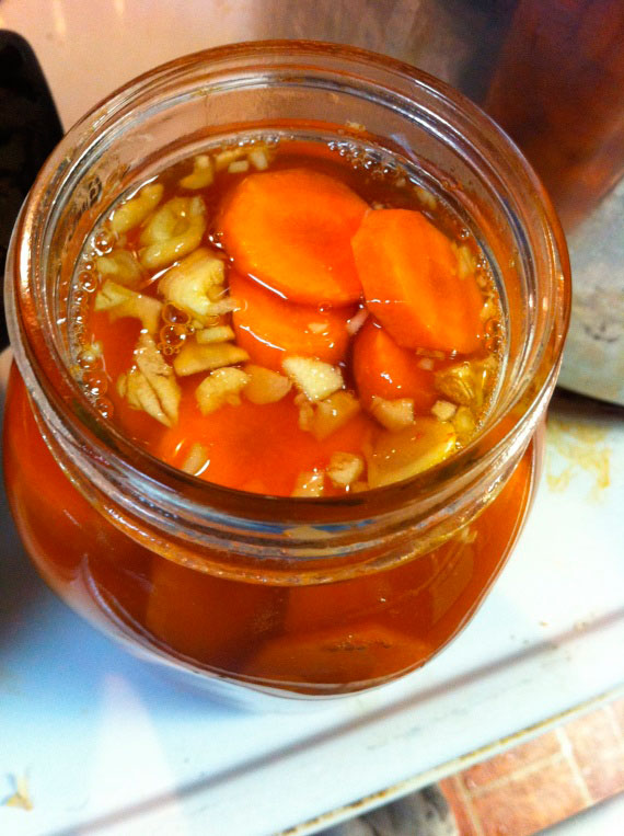 Далее, морковь в маринаде снимаем с огня, добавляем к ней разрезанные пополам чеснок и острый перец, перемешиваем, выкладываем в банку и закатываем. Готовую баночку с салатом «Маринованный» следует простерилизовать в течении 15 мин. Морковь готова к зиме!