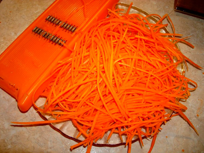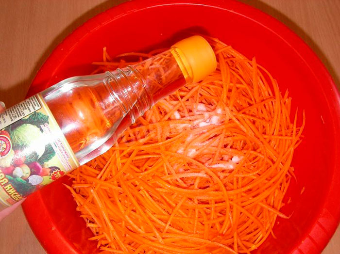 Для начала следует подготовить основной ингредиент — морковь. Для этого натираем овощ на тёрку для корейской морковки, помещаем в глубокий таз, или миску и добавляем туда сахар, соль, перец, измельчённый чеснок, уксус и растительное масло. Далее, все эти ингредиенты следует тщательно перемешать и оставить настояться примерно на 8 — 10 часов в прохладном месте.