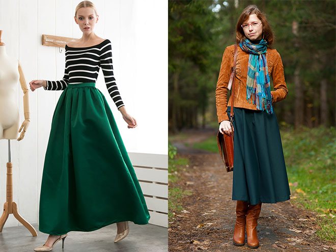 Длинная зеленая юбка никого не оставит равнодушным и вызовет живое внимание к своим обладательницам. Сегодня этот цвет в тренде, цвет листвы, природы, влечет к себе. Умиротворяет и успокаивает, вызывает доверие. Тем более что оттенков у юбок зеленого цвета существует настолько много, что каждая девушка может создать свой неповторимый образ. Особенно если это зеленоглазая блондинка, не говоря уже о рыженьких красотках с солнечными веснушками.