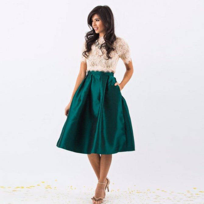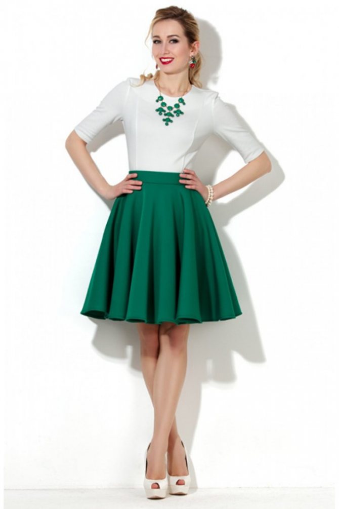 Такой фасон подойдет любой женщине. Его отличительная черта – воздушность. Для зеленой юбки-солнце прекрасным выбором будет светлая блузка или топ.