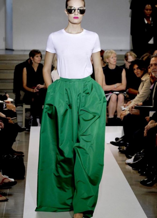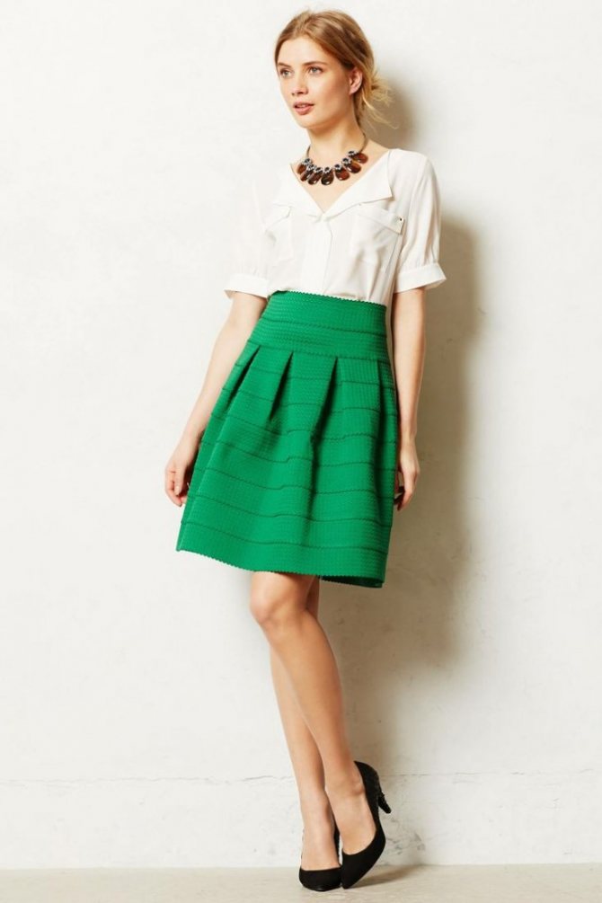 Лидирующее место в этом году у юбок ярких оттенков зеленого. Их обязательно нужно носить с черным верхом.