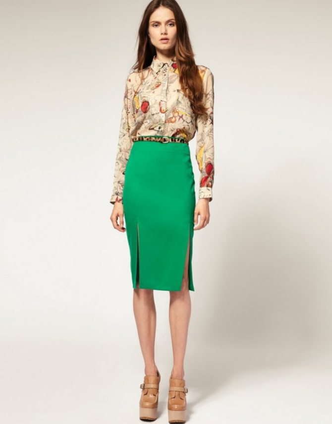 Зеленая юбка-карандаш чудесно выглядит с белой блузкой классического стиля. Юбку светлых оттенков зеленого можно смело сочетать с персиковым, песочным или нежно-кремовым верхом.