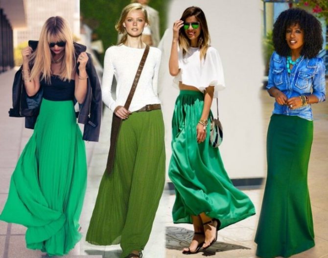 Большой популярностью пользуются длинные зеленые юбки в пол. К такой модели прекрасно подойдет черная кружевная блуза. Сверху можно накинуть стильный черный жакет сложного кроя, а на ноги надеть туфли черного или красного цвета.